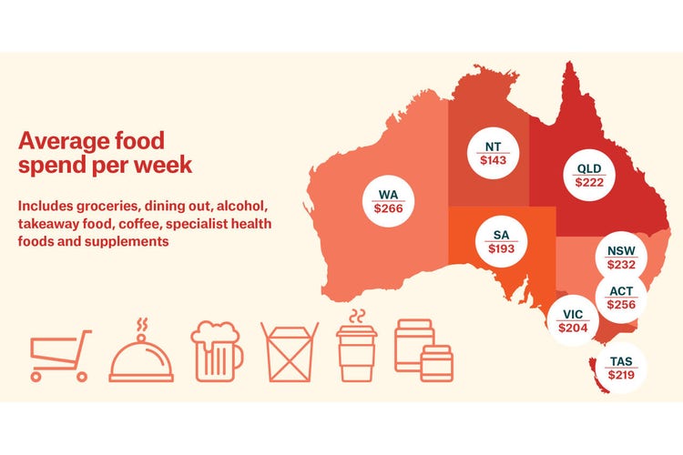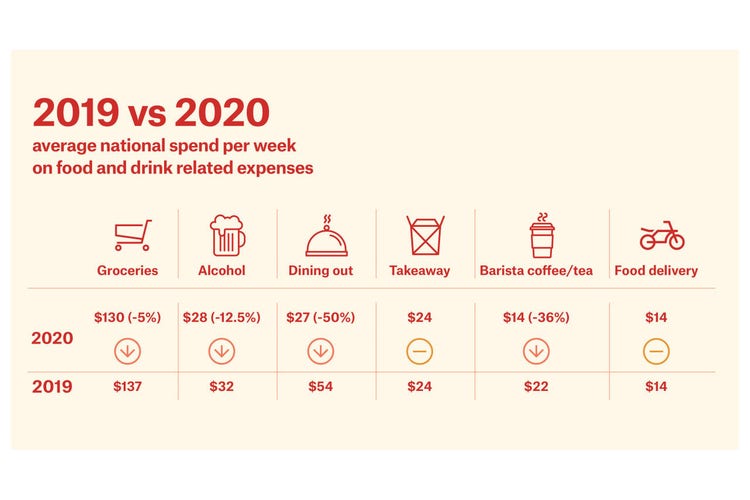 “Across all food expenses, the research revealed the average Australian has dropped their weekly food budget to $130 for groceries, $28 for alcohol, $24 for takeaway food, $14 on food delivery and $14 per week on coffee and tea,” Mr Evans said.